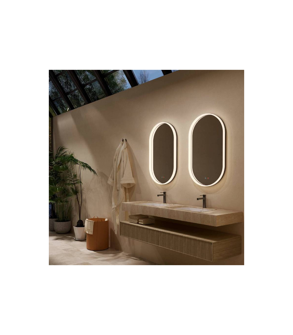 Sistema de iluminação LED com três temperaturas de cor que permite adaptar o ambiente às necessidades do momento, proporcionando uma luz suave e homogénea distribuída por toda a moldura.