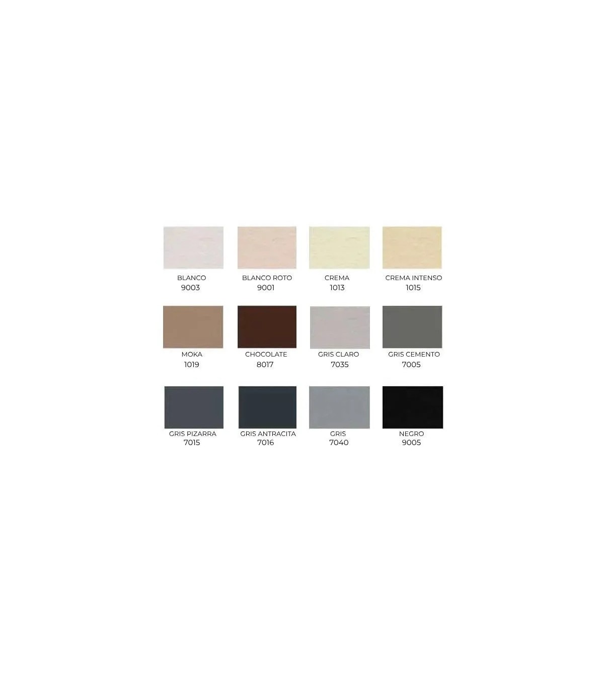 Cores disponíveis: Branco 9003, Bege 9001, Creme intenso 1015, Moka 1019, Chocolate 8017, Cinzento claro 7035, Cinzento cimento 7005, Cinzento antracite 7016 e Preto 9005.