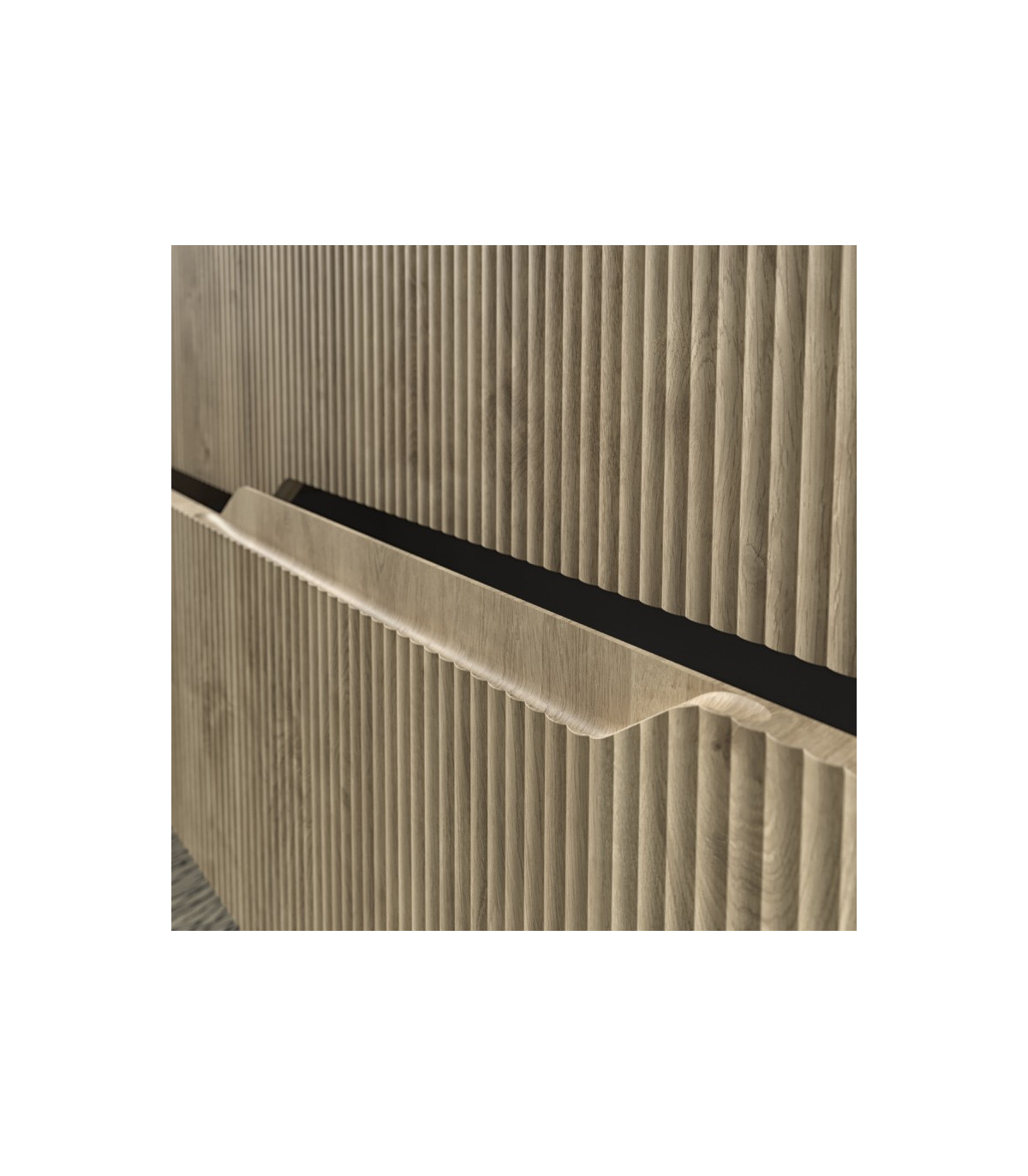 Móvel com frentes ranhuradas e texturadas.