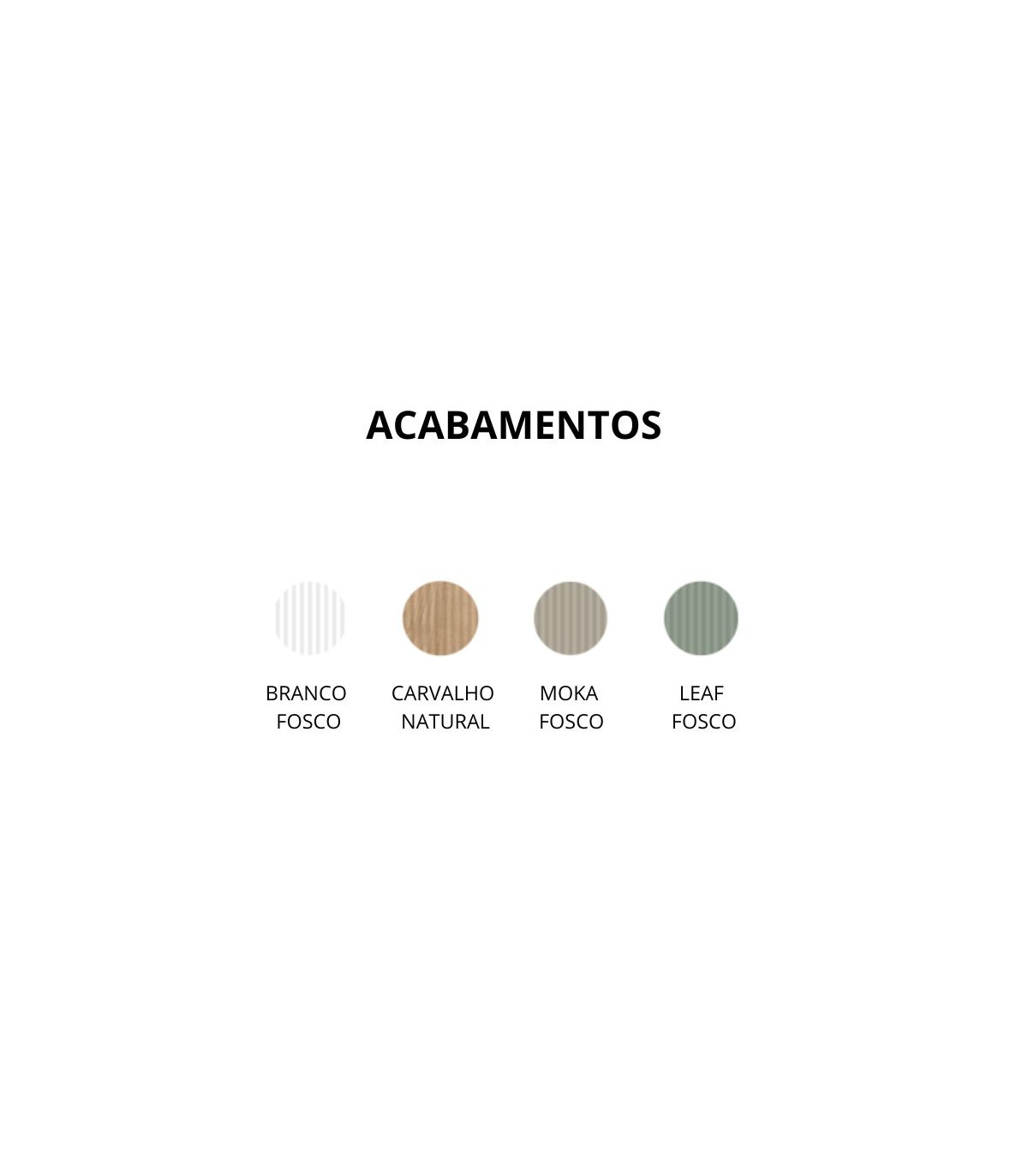 Disponível nas seguintes cores e acabamentos: Branco Mate, Carvalho Natural, Mocha Mate e Folha Mate.